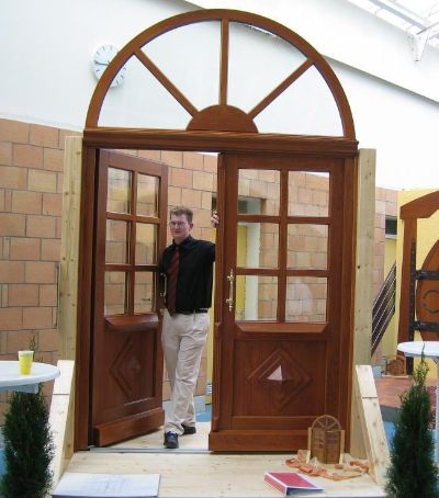Haustüre mit Glas Ausschnitt System Beckh, Holzart Kiefer / Meranti 3 Fach verleimt , Beschlag 5 Fachverriegelung , Haustürgriff Hewi , Flügeldichtungs System , Anstrich System Sikkens